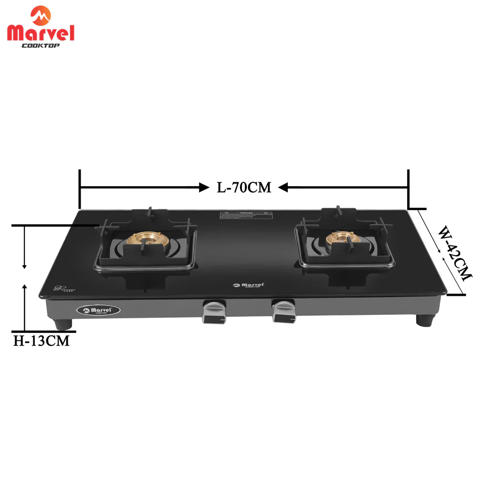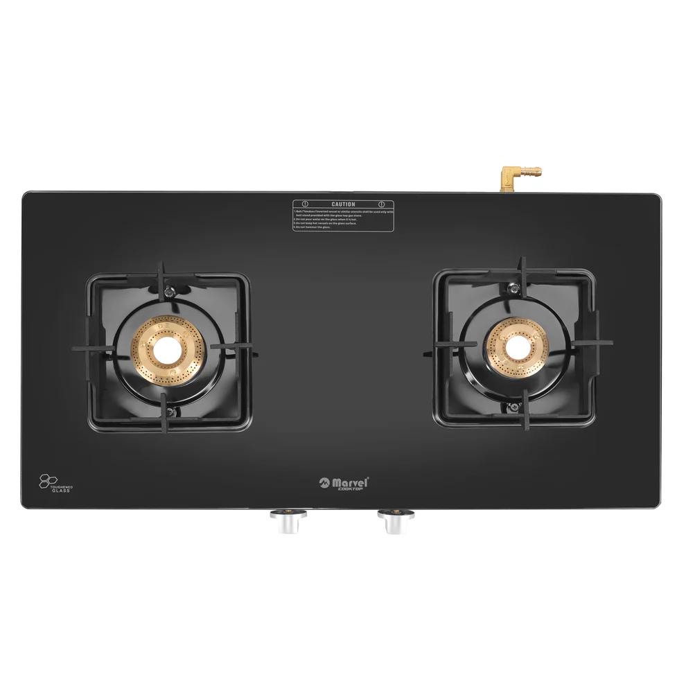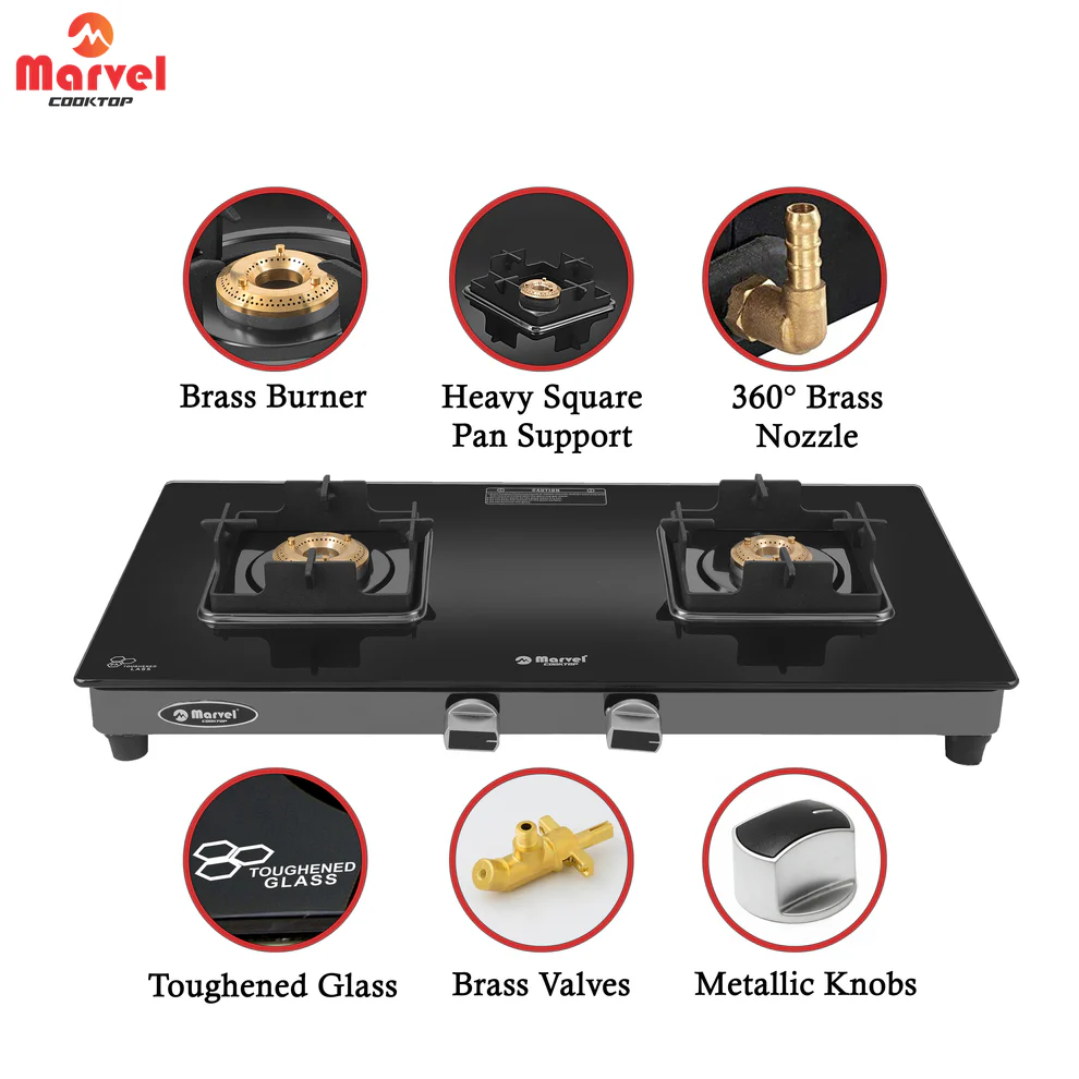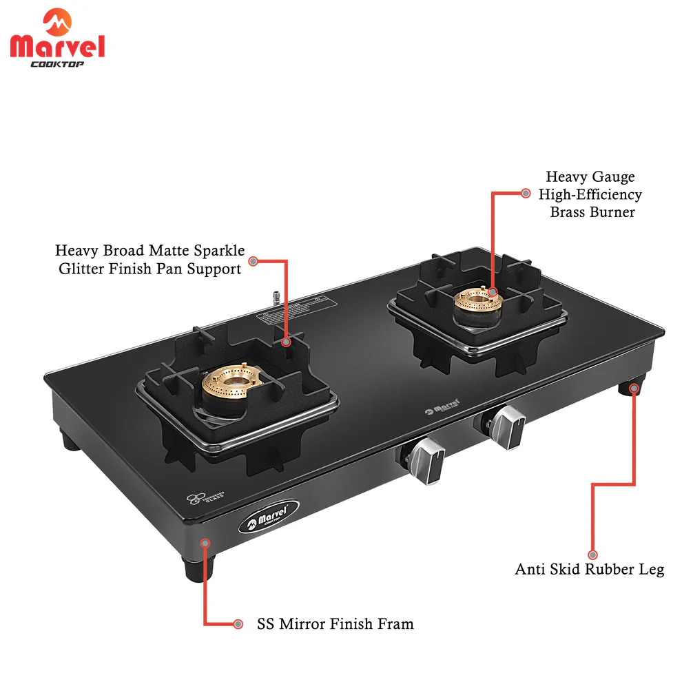 Cooktop Marvel – 2 Burner Crystal Black Glass Gas Stove with Black SS Mirror Finish Frame, Square Pan Support, Brass Top (DOOM – 2502)