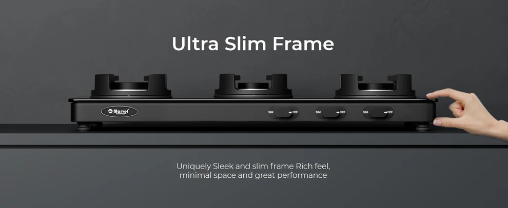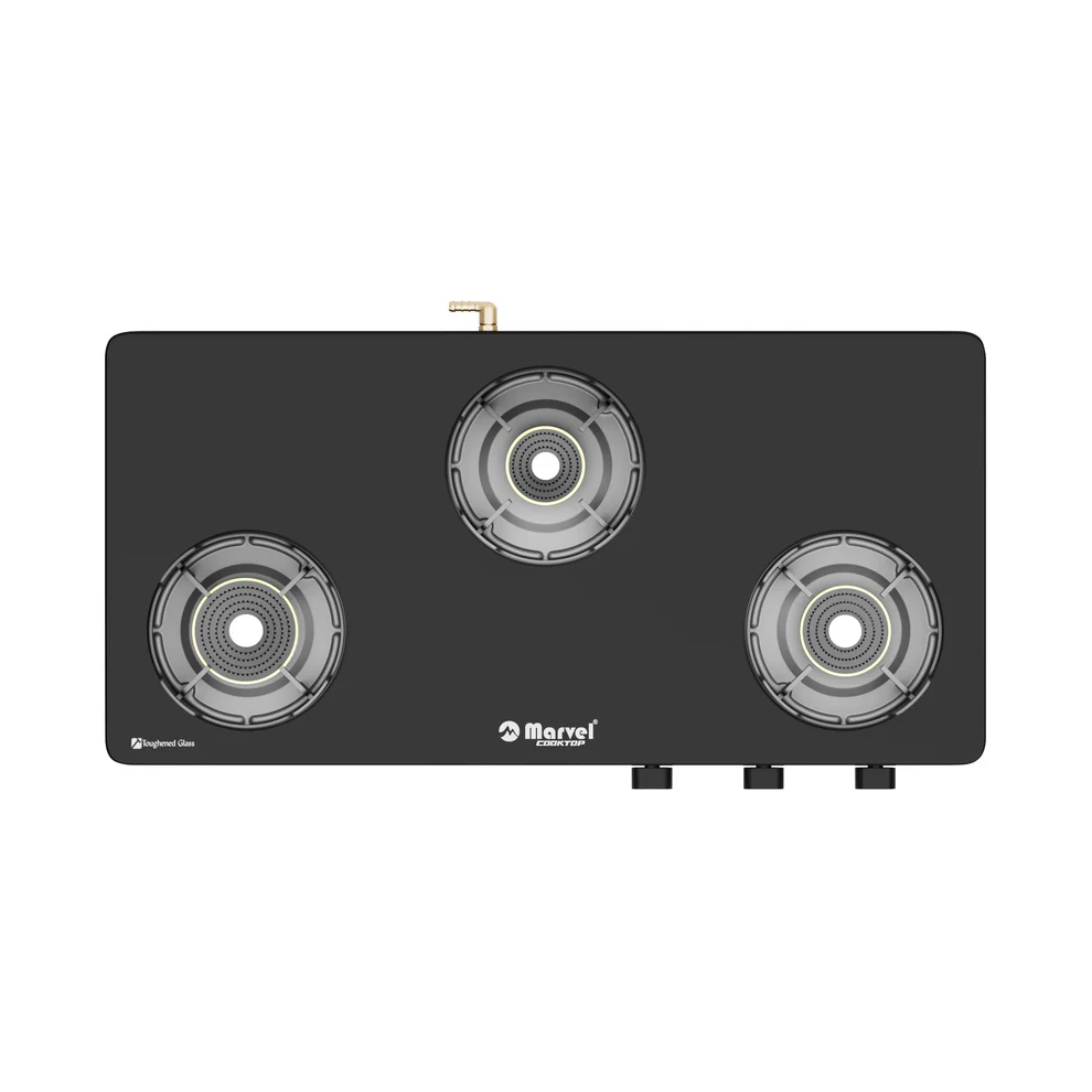 Cooktop Marvel – 3 Burner Gas Stove with double shade gray black glass. Designed for modern Indian kitchens, this stove combines durability and elegance with powerful performance.