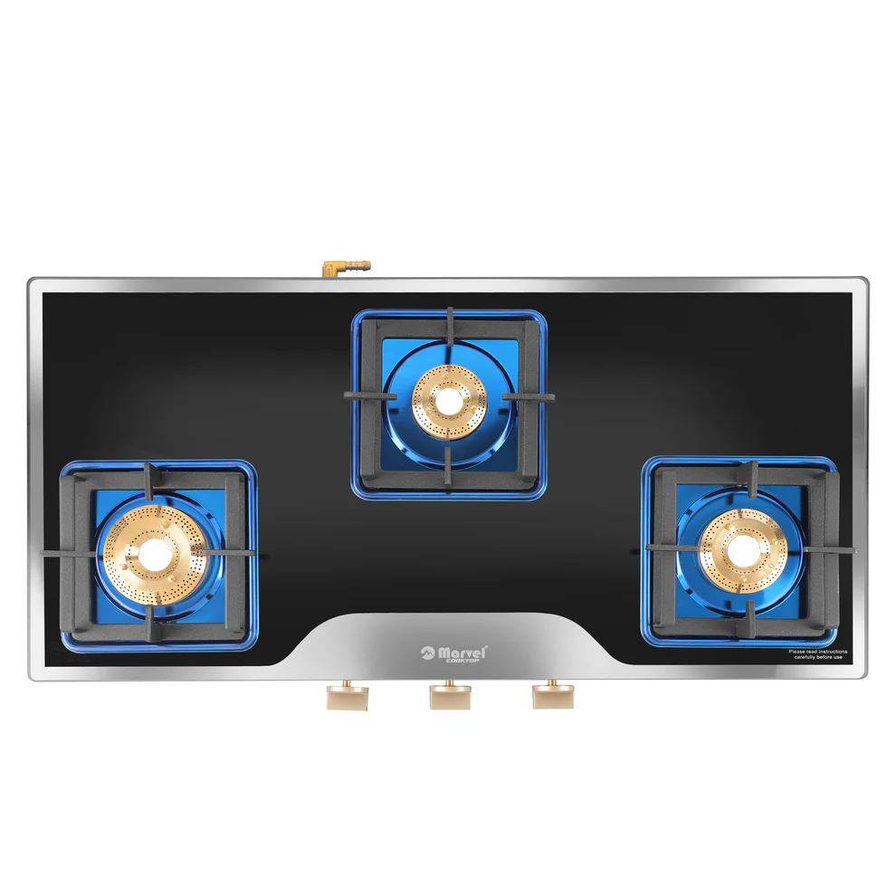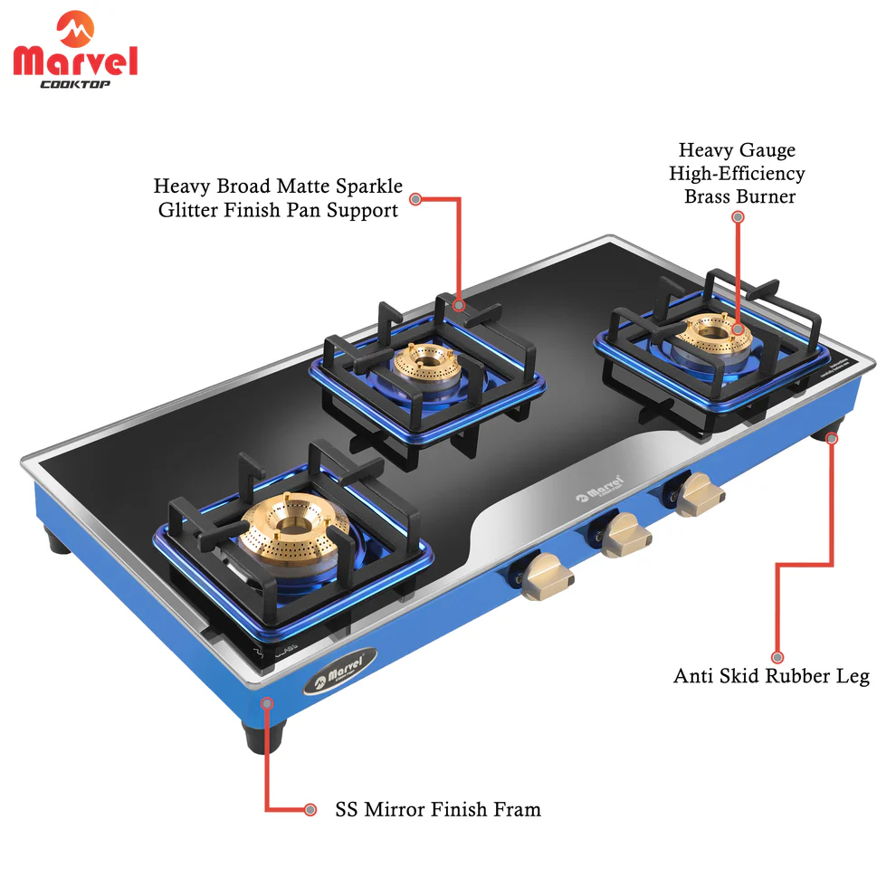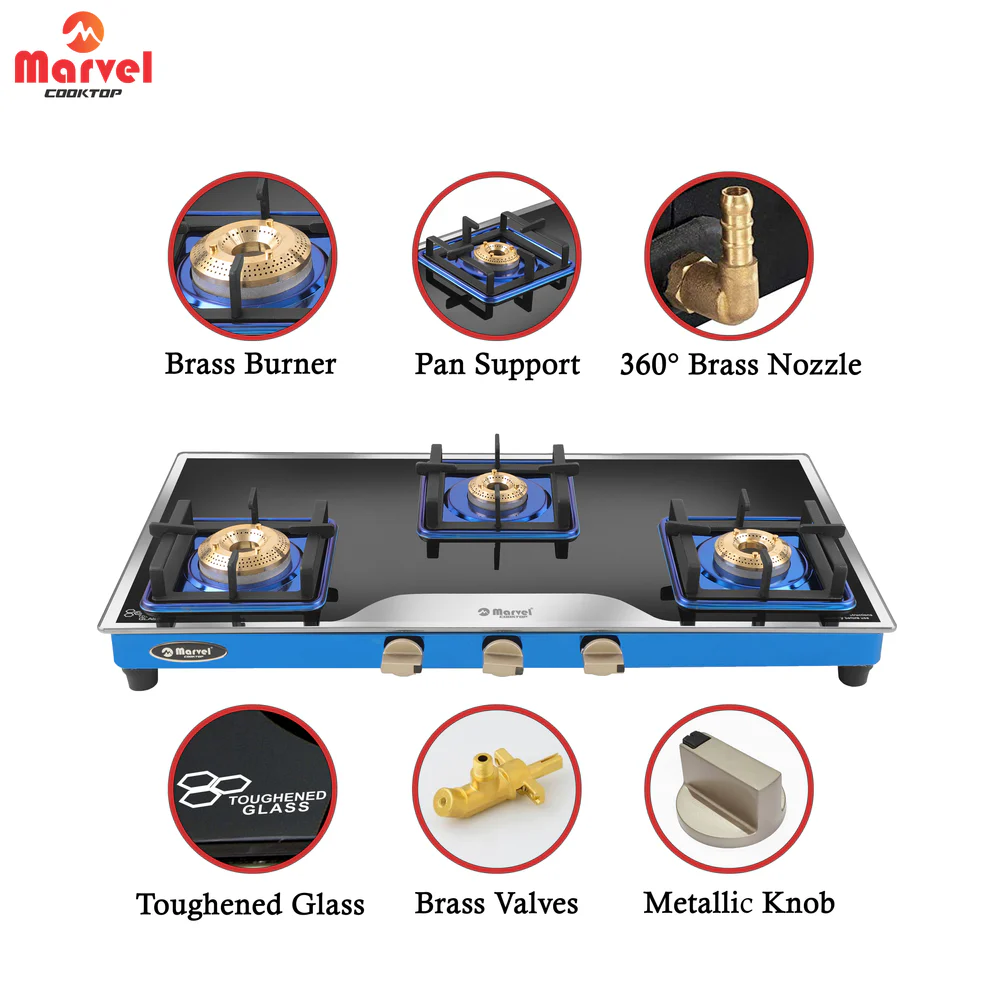 Cooktop Marvel – 3 Burner Premium LPG Gas Stove | Elite Mirror Glass, Blue SS Mirror Frame, Square Pan Support | Brass Top (BEAST – 3503)