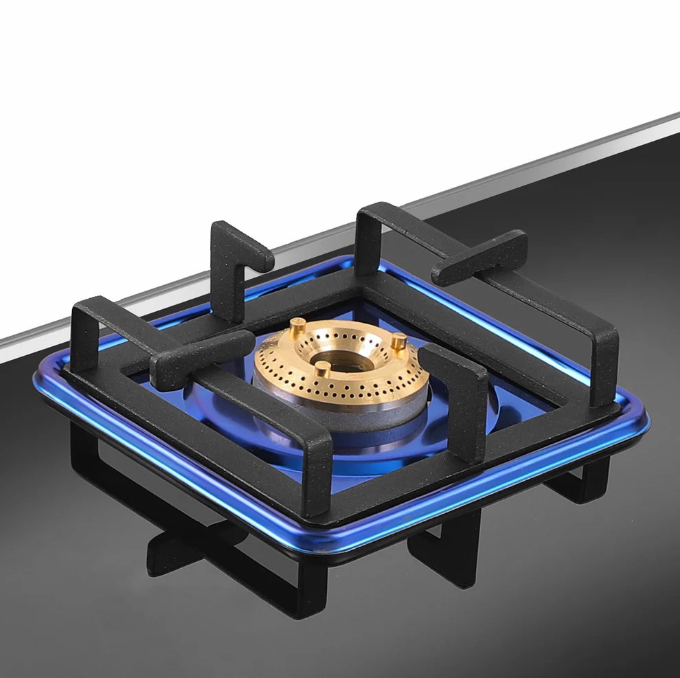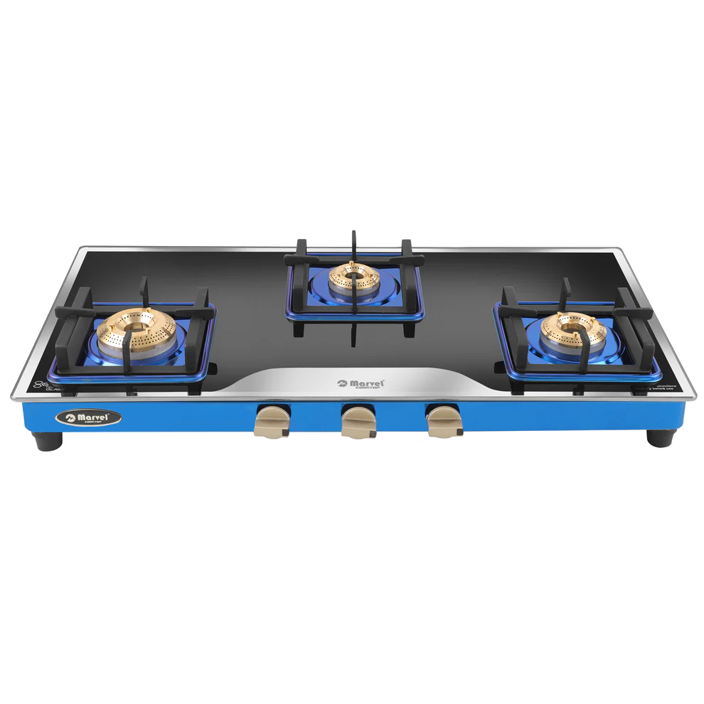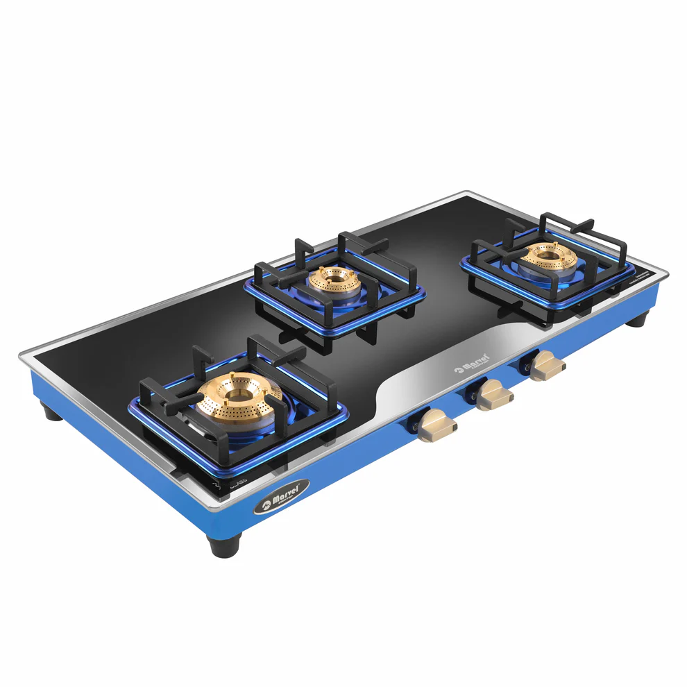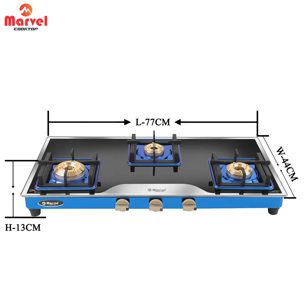 Cooktop Marvel – 3 Burner Premium LPG Gas Stove | Elite Mirror Glass, Blue SS Mirror Frame, Square Pan Support | Brass Top (BEAST – 3503)