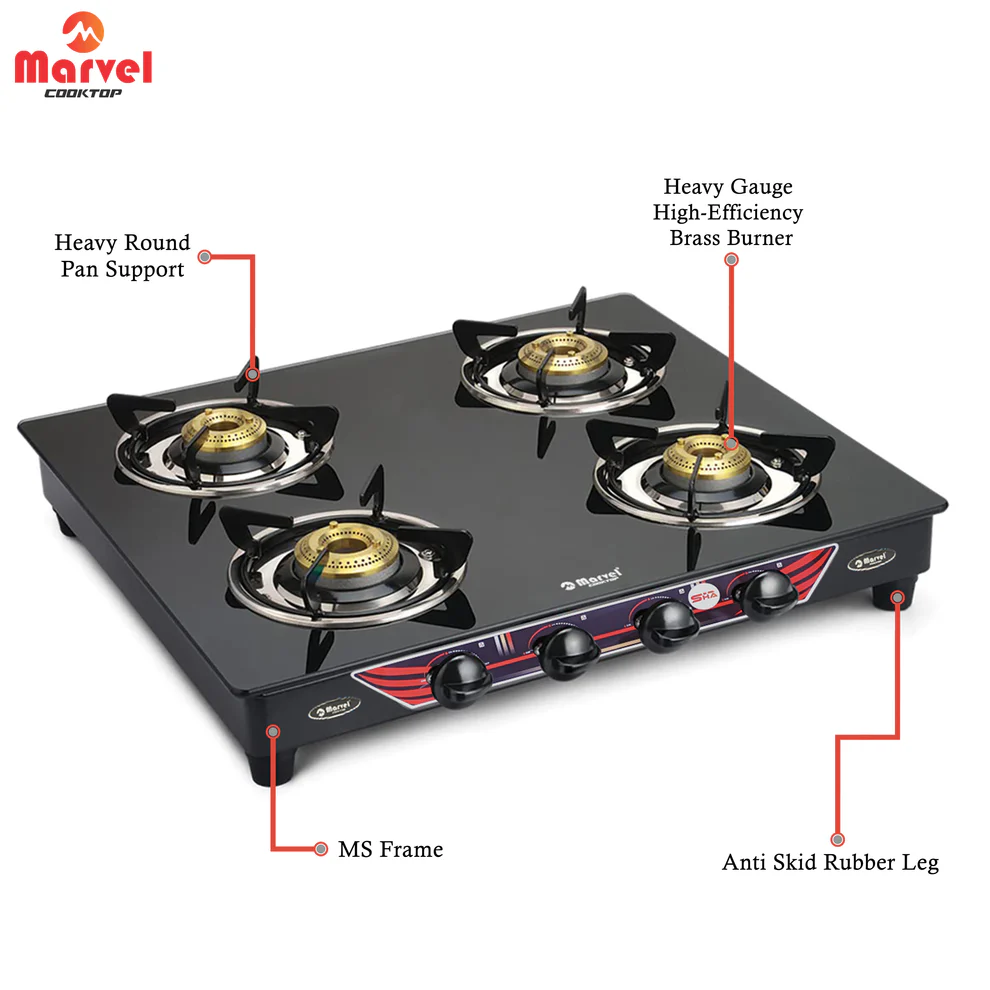 Experience premium design and performance with the Cooktop Marvel 4 Burner Gas Stove, crafted for modern Indian kitchens. Designed with stunning mirror-finish frames and powerful brass burners, it combines style, strength, and safety.
